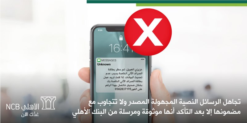 البنك الأهلي التجاري Twitterissa تجاهل الرسائل النصية المجهولة المصدر ولا تتجاوب مع مضمونها إلا بعد التأكد أنها موثوقة ومرسلة من البنك الأهلي