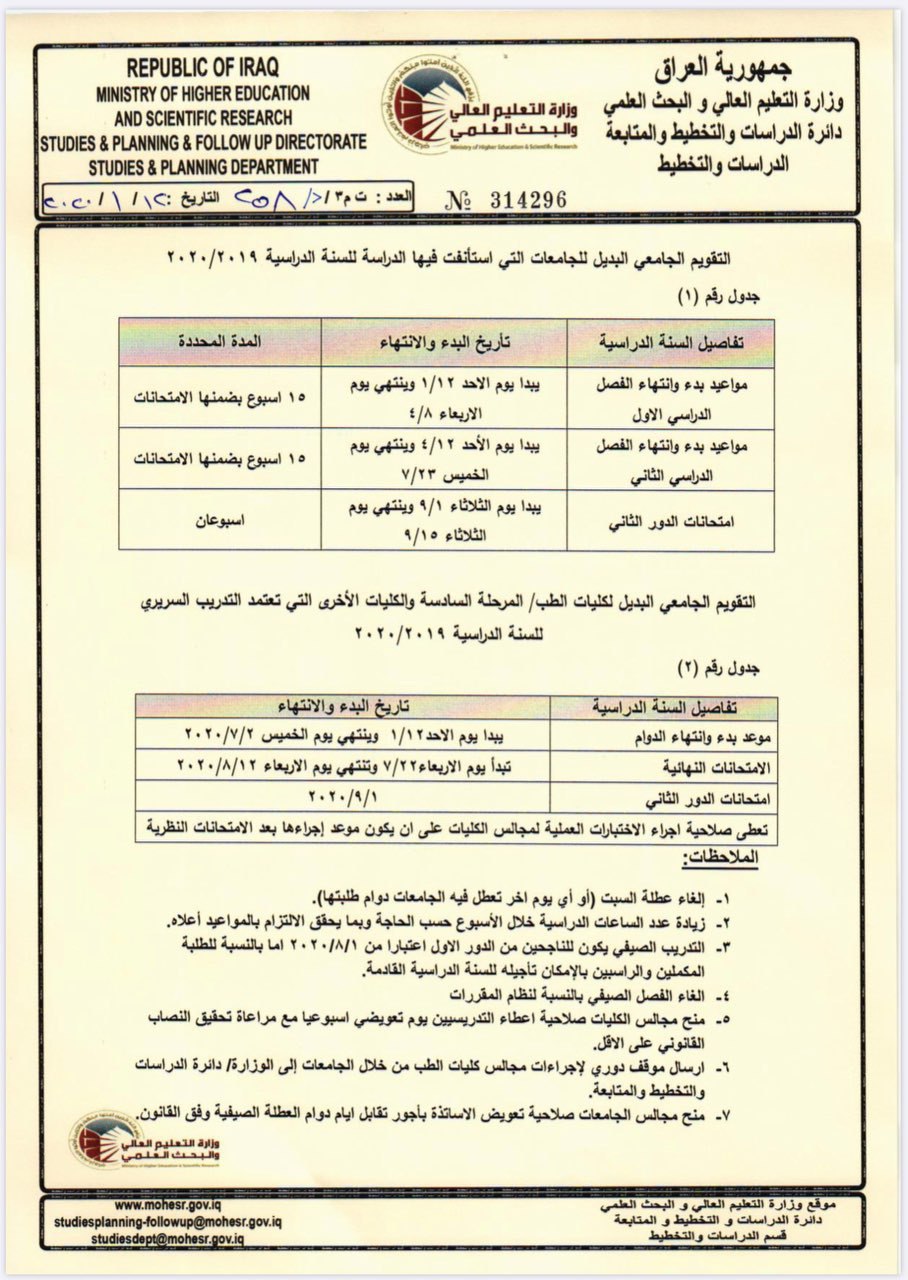 وزارة التعليم العالي تعلن التقويم الجامعي الجديد لبدء الدوام والأمتحانات لطلبة الجامعات والكليات الحكومية والأهلية 2020 Kn Karrarnet موقع الأسئلة الوزارية
